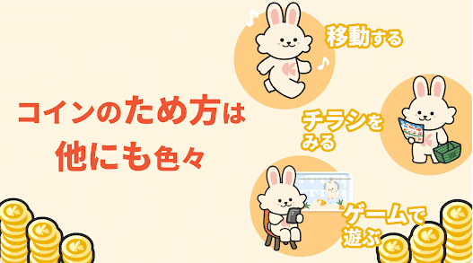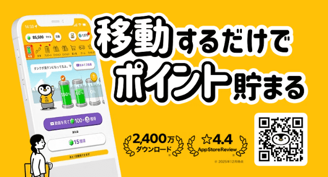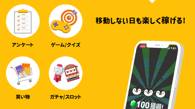 トリマと同様に、歩数や移動距離に応じて自動的にゲージが貯まり、ポイントに交換できます。電車やバスでの移動もカウントされるため、通勤・通学時間を有効活用できます。他の歩数計アプリと併用することで、同じ歩数で複数のポイントを獲得することも可能です。(歩数の他に時間経過で貯める機能もあります)